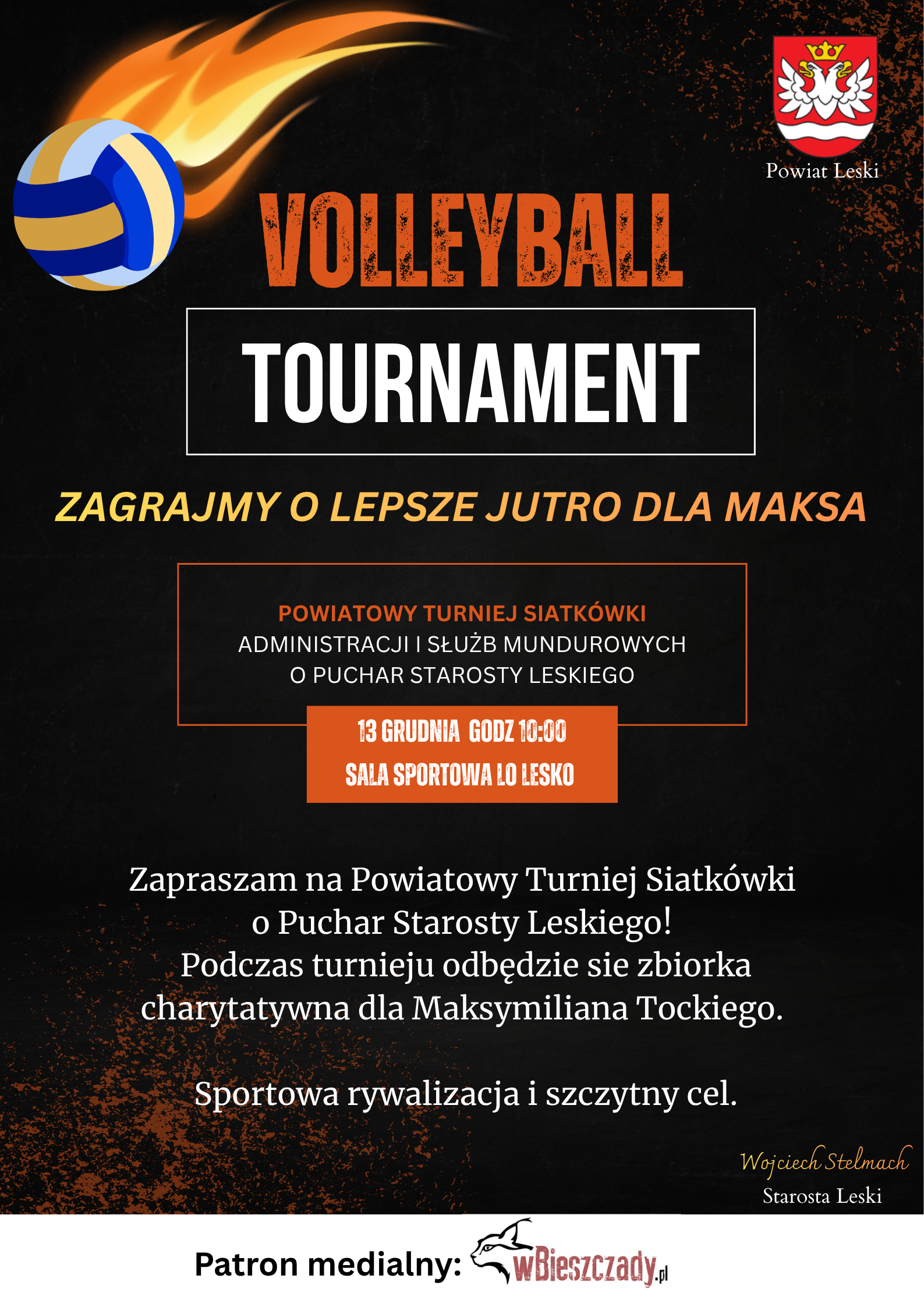 zbiórka charytatywna na rzecz Maksymiliana Tockiego. Oprócz sportowej rywalizacji o Puchar Starosty Leskiego czeka nas dzień pełen emocji, integracji i wspólnego działania w szczytnym celu.